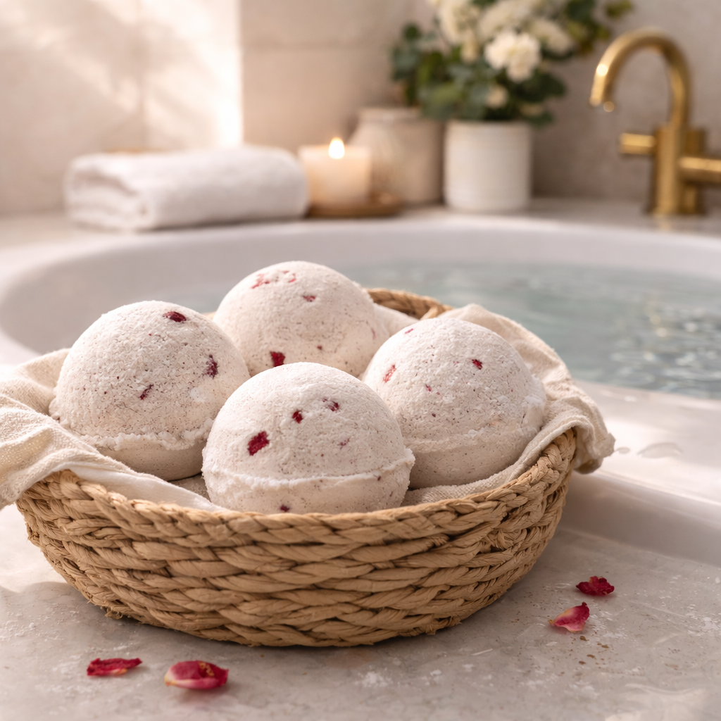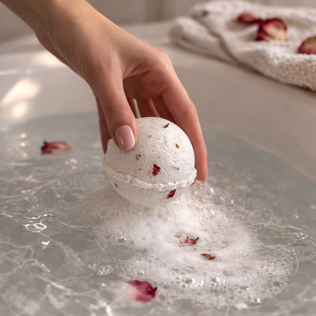 Offrez-vous un moment suspendu avec ROMANCE, une balle effervescente au parfum délicat de rose et de vanille.